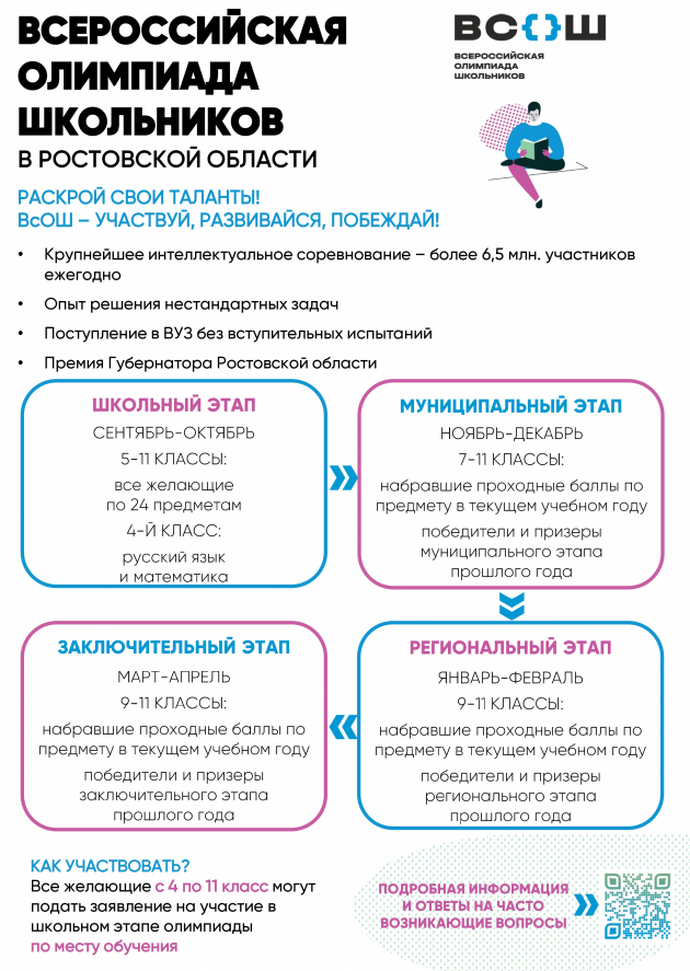 Всероссийская олимпиада школьников ежегодно проводится по 24 предметам, в ней участвуют более 6 миллионов человек. В соревновании четыре этапа: школьный, муниципальный, региональный и заключительный. В школьном этапе может участвовать любой желающий, начиная с пятого класса (а соревнования по русскому языку и математике начинаются уже в четвертом).